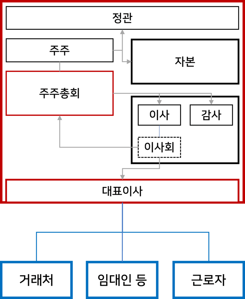대표이사는 최종적으로 회사를 대표하는 자이고, 파란색 사각형은 법적으로 회사를 구성하는 것이 아닌 회사와 계약관계를 가지는 외부인입니다.